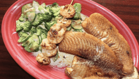 If you like Tilapia, you will love ours! Seasoned & Grilled to perfection with a Skewer of Grilled Shrimp, Broccoli & Zucchini drizzled with Cheese Sauce.